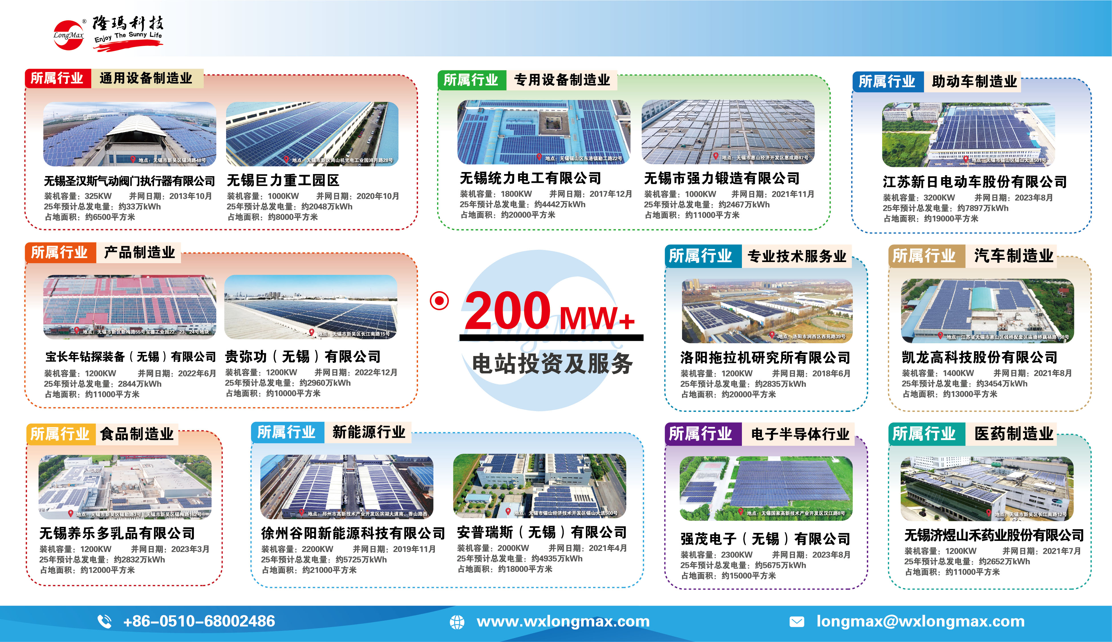 自2002年成立以來,隆瑪科技在光伏電站領(lǐng)域深耕細(xì)作,累計(jì)投資建設(shè)及服務(wù)超過200座電站,裝機(jī)總?cè)萘?/span>超200MW。公司先后投資建設(shè)了統(tǒng)力電工、新日電動車、寶長年鉆探裝備、養(yǎng)樂多、安普瑞斯、強(qiáng)茂電子、凱龍高科、濟(jì)煜山禾藥業(yè)等眾多屋頂光伏電站項(xiàng)目,見證了綠色能源的廣泛應(yīng)用與深遠(yuǎn)影響。展望未來,隆瑪科技期待與更多志同道合的伙伴攜手共進(jìn),持續(xù)探索可持續(xù)發(fā)展的新路徑,為構(gòu)建更加美好的生態(tài)環(huán)境貢獻(xiàn)我們的力量。讓我們在綠色發(fā)展的征途上,砥礪前行,共創(chuàng)新的輝煌!