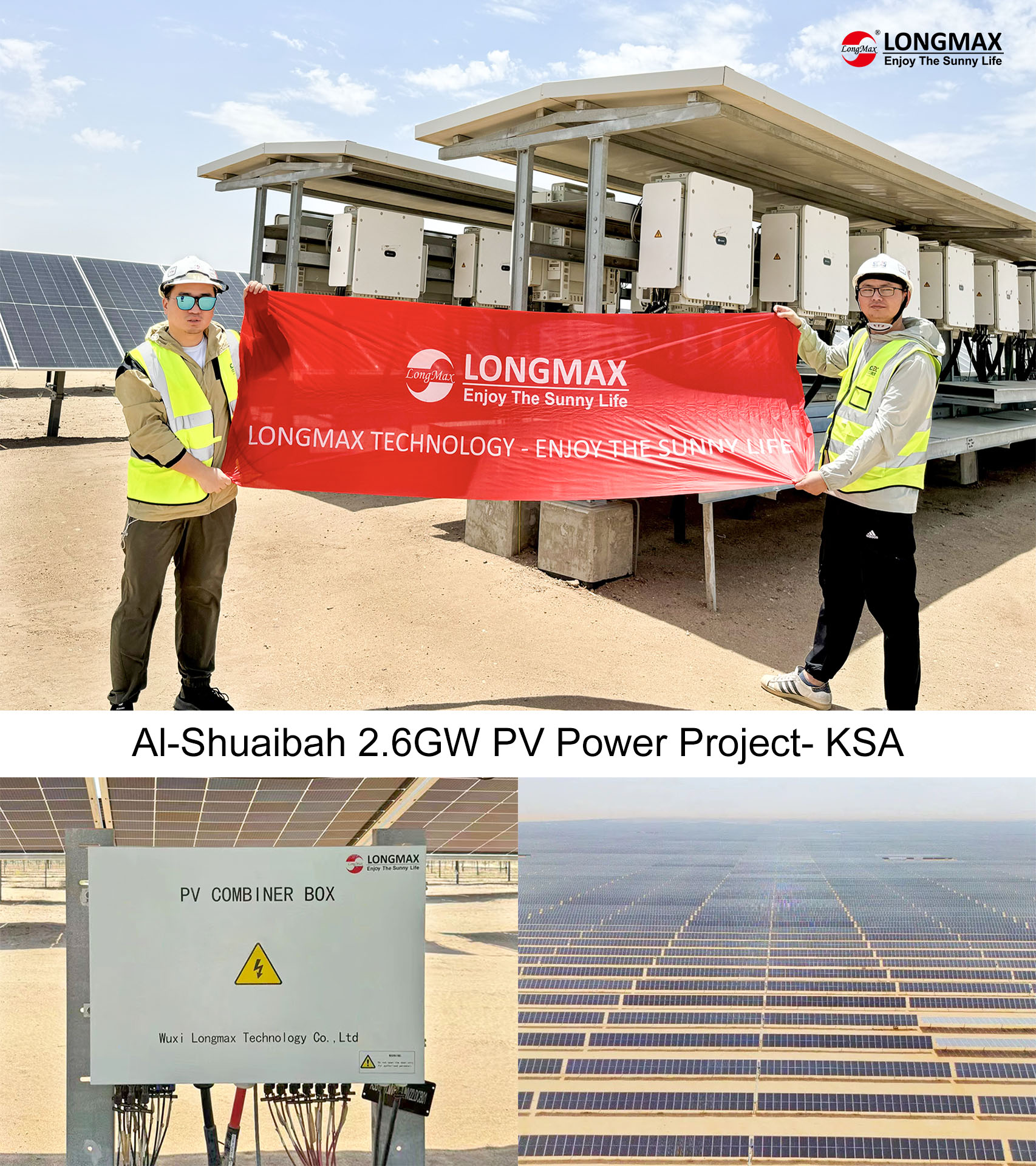 In spite of the high temperature and heat wave, Longmax's team came to the first station - the 2.6GW PV project in Alshubah, Saudi Arabia. As an important partner of the project, Longmax Technology provided a total of 600MW of PV convergence boxes for the project, laying a solid foundation for the stable operation of the world's largest PV power plant.