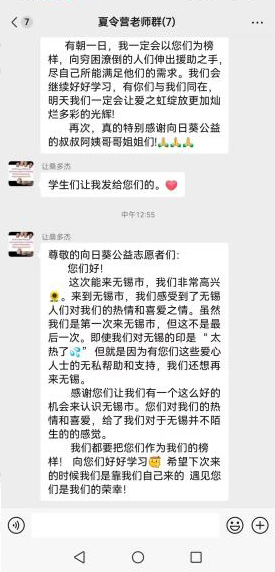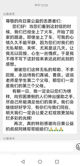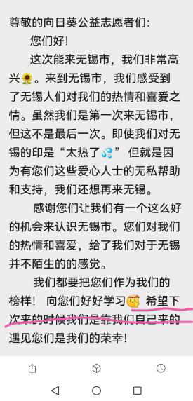 “遠(yuǎn)方少年無錫游”活動(dòng)不僅是一次簡(jiǎn)單的旅行,更是一次成長(zhǎng)的歷練。它讓少年們?cè)谔剿髦惺斋@了知識(shí),在體驗(yàn)中感受了文化,在分享中增進(jìn)了友誼。在活動(dòng)結(jié)束后,向日葵公益的志愿者老師們收到了少年們?cè)诜党袒疖嚿习l(fā)來的感謝信,他們用真誠(chéng)質(zhì)樸的語言表達(dá)著感激,訴說著未來。相信這段美好的經(jīng)歷已將希望悄悄播種,將會(huì)在他們?nèi)松猛局虚_出絢爛之花。